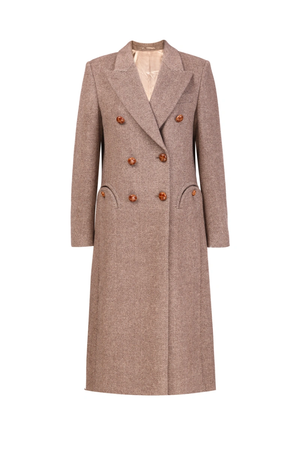 STYLE DETAILS: Double breasted overcoat with a wide, peaked lapel, and smile pockets
