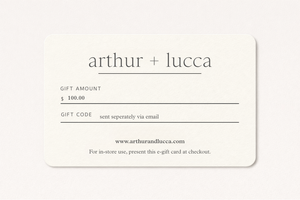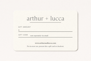 Gift cards will be sent via email immediately to the purchaser's email listed and are non-refundable. You may forward the email or send the link/code to the recipient of the gift card. Arthur + Lucca is not responsible for any unauthorized gift card use and will not be able to re-add value for any reason. A+L gift cards never expire.